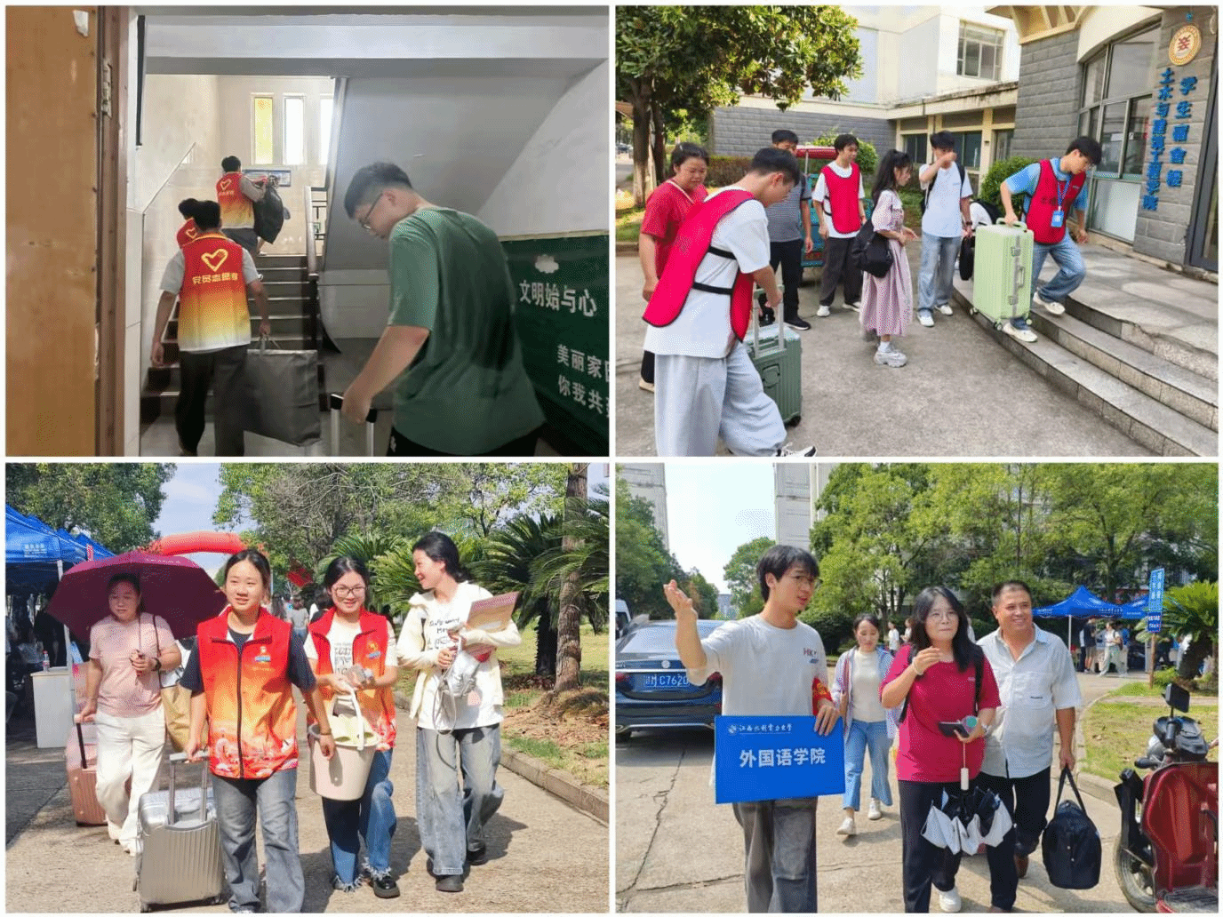 细致指引,主动帮扶。在各学生楼栋报到点,学生党员们分工明确、热情服务,为新生及家长细致讲解报到流程,从身份核验、校园卡领取到事项答疑,确保迎新工作高效有序、温暖贴心。面对新生携带行李较多,他们主动接过沉甸甸的行李箱,穿梭奔波在各学生楼栋中,用行动诠释责任与奉献。