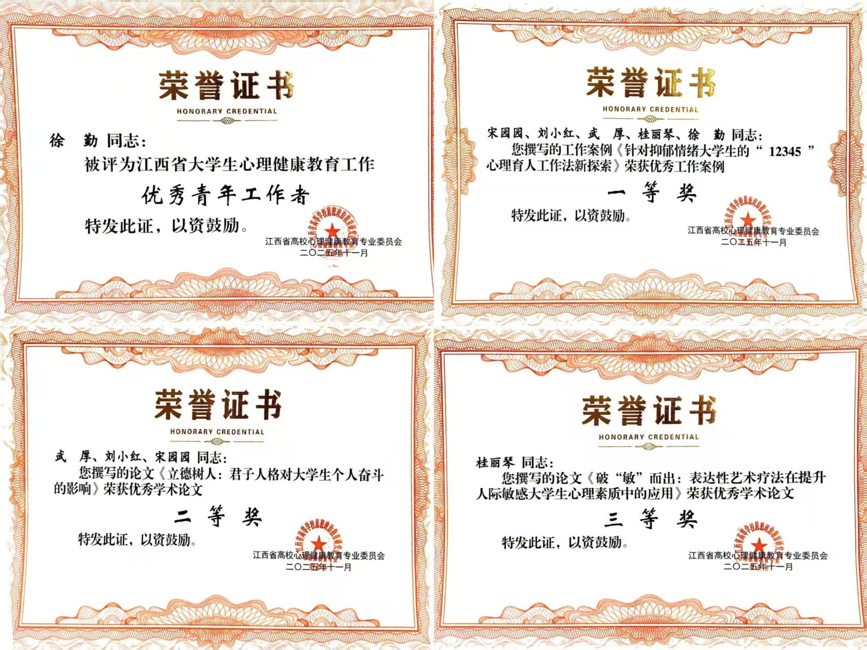 本次年会表彰了年度优秀集体与个人,我校教师表现突出。其中,徐勤老师获评“江西省大学生心理健康教育工作优秀青年工作者”;宋园园等人提交的案例《针对抑郁情绪大学生的“12345”心理育人工作法新探索》荣获优秀工作案例一等奖;武厚等人的论文《立德树人:君子人格对大学生个人奋斗的影响》获优秀学术论文二等奖;桂丽琴的论文《破“敏”而出:表达性艺术疗法在提升人际敏感大学生心理素质中的应用》获优秀学术论文三等奖。
