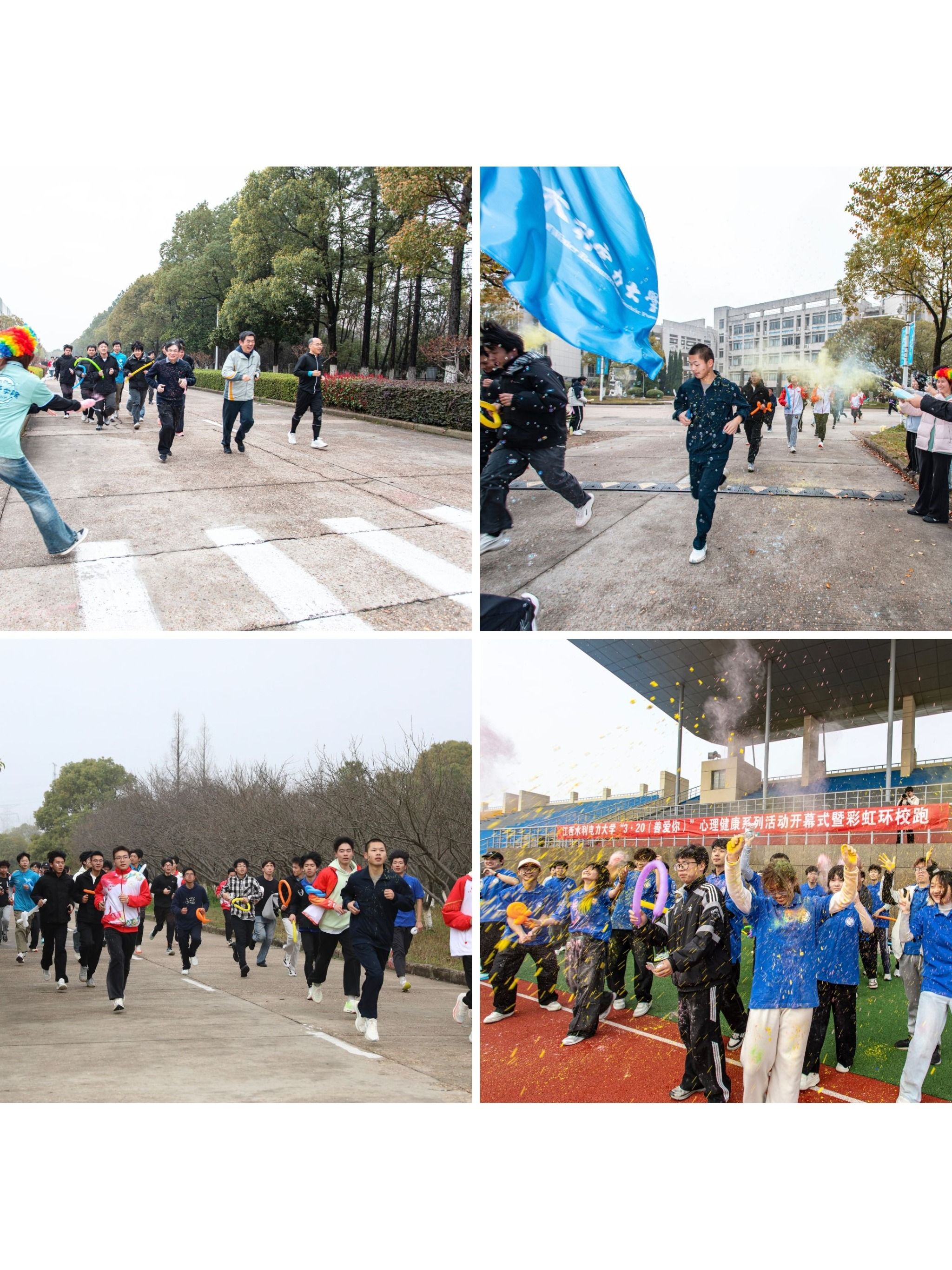 本次彩虹环校跑以“缤纷奔跑 释放心晴”为主题,打破传统竞技跑步的紧张氛围,将运动与趣味、减压与互动深度融合。本次活动全程2.8公里,围绕瑶湾水利风景区主要景点开展,途径六干渠首、水文化广场、水轮镇宝和小湿地四个打卡点。活动开始,在领操员的带领下,伴随着动感的音乐节奏,同学们开始了充满活力的跳操热身。热身后,在领跑同学带领下,师生欢呼冲出起跑线,正式开启了这场色彩与欢乐的盛宴。沿途志愿者向奔跑的同学们撒播彩粉传递祝福,将体育锻炼与心理调适有机结合。活动期间,同学们既领略了校园风光,更在运动中释放压力,舒展身心,在互动与欢笑中展现了新时代大学生坚韧向上、朝气蓬勃的精神风貌。